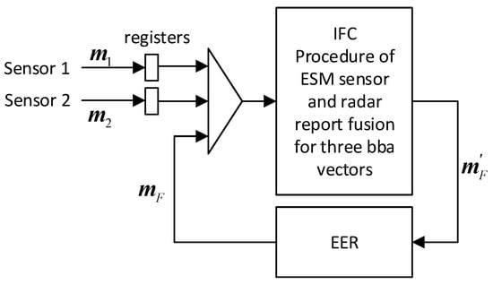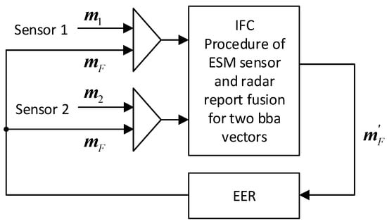 wherein is a vector of the generalized BBA measure determined by the rule based on the previous generalized BBA measure vector and the new BBA measure vectors and sent by both sensors. The diagram of identification information fusion from the ESM sensors is shown in Figure 3.