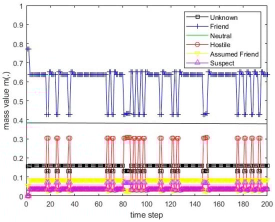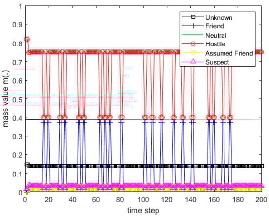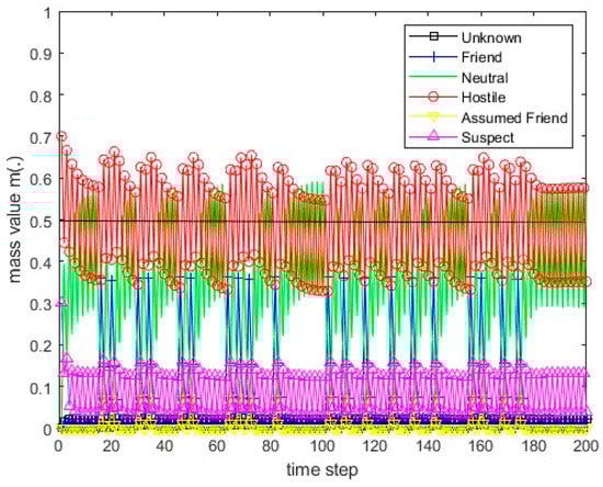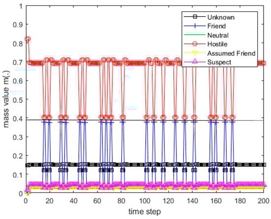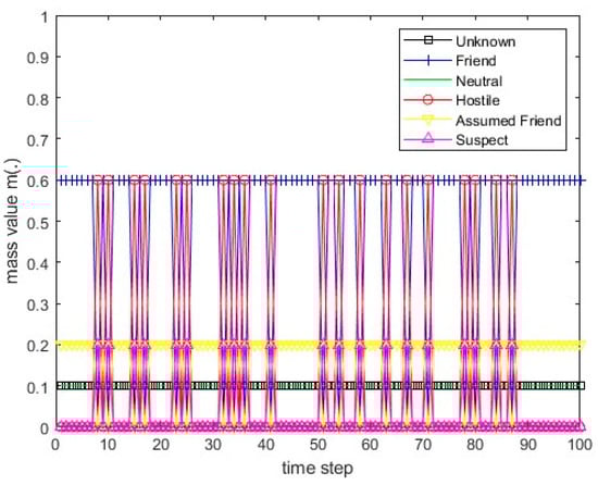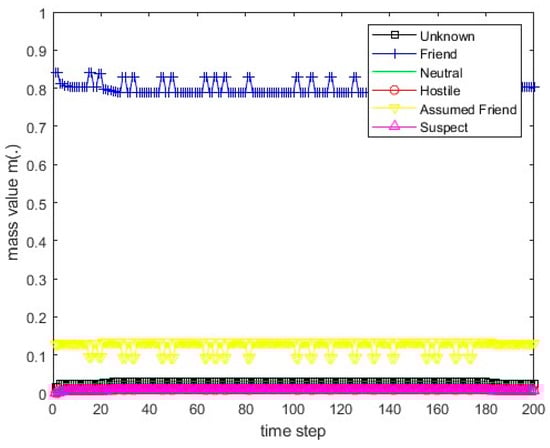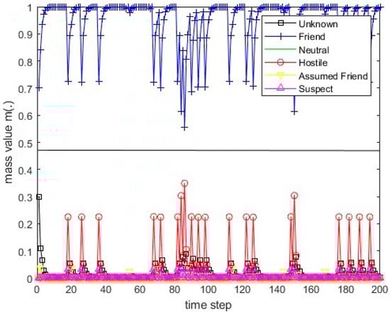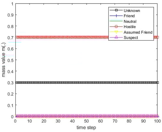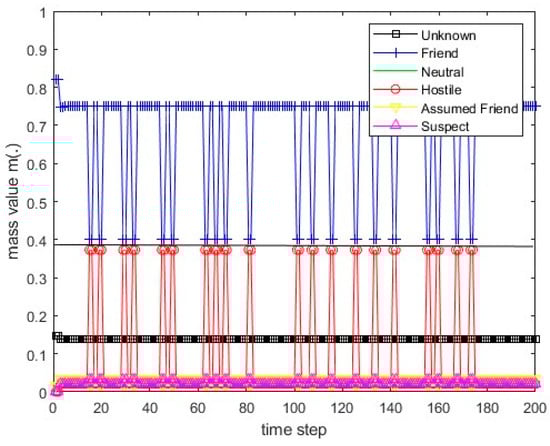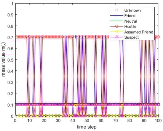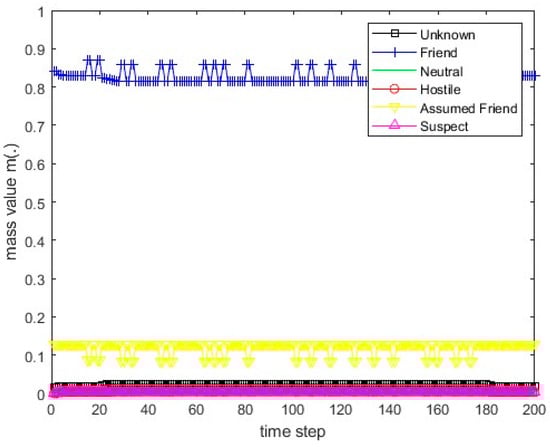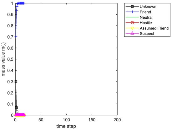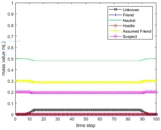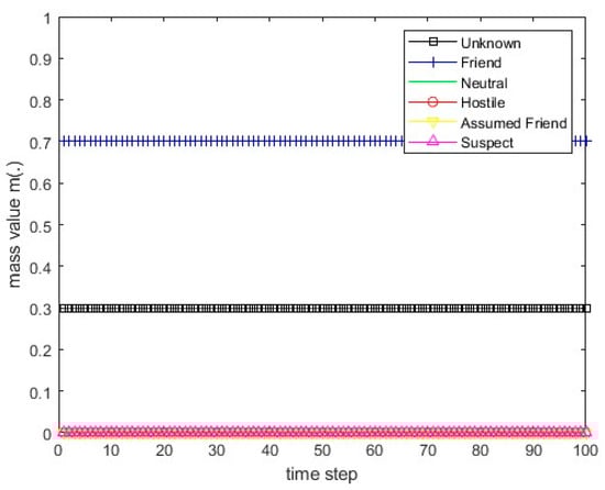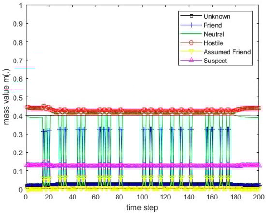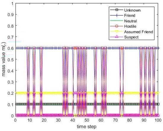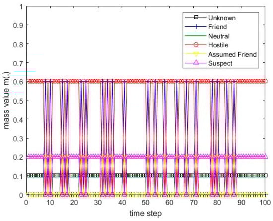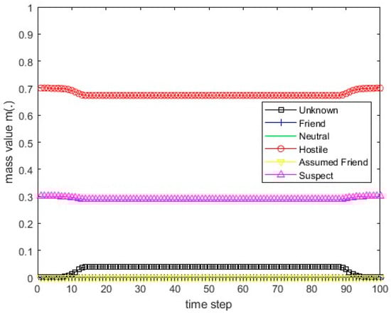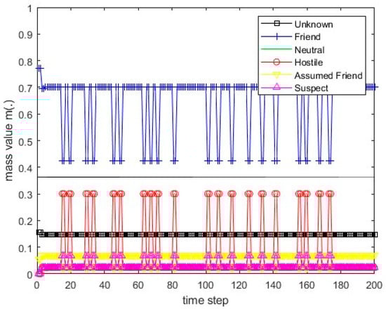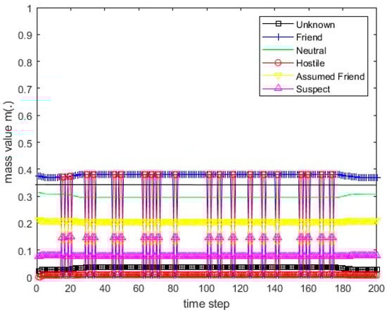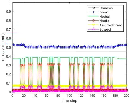 The simulation results of identification information fusion using the PCR5 rule for two BBAs for deterministic scenarios 1–6 are presented in Figure 63, Figure 64, Figure 65, Figure 66, Figure 67 and Figure 68.