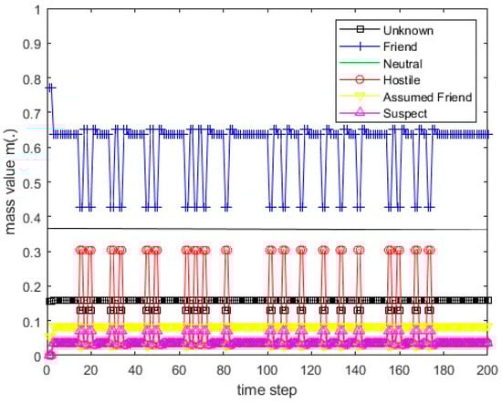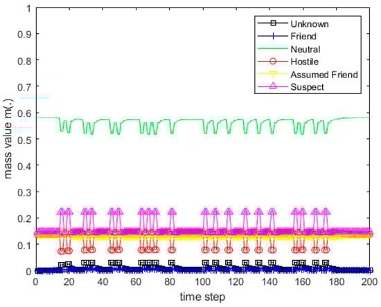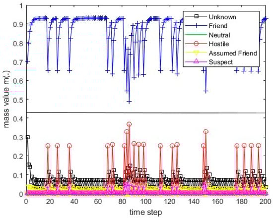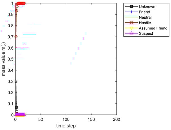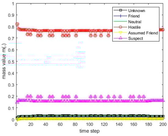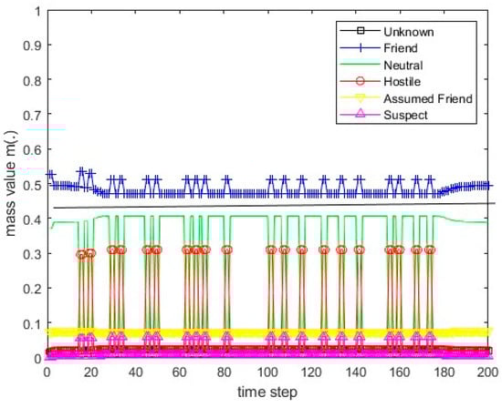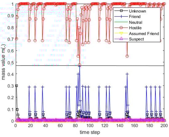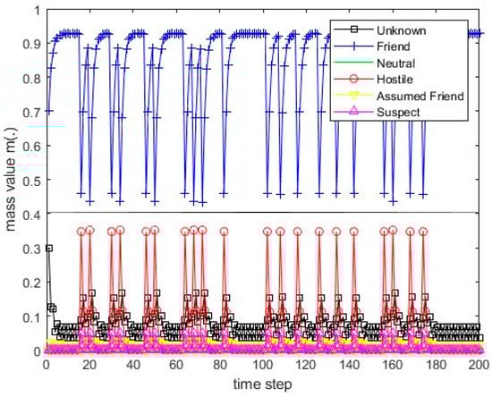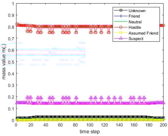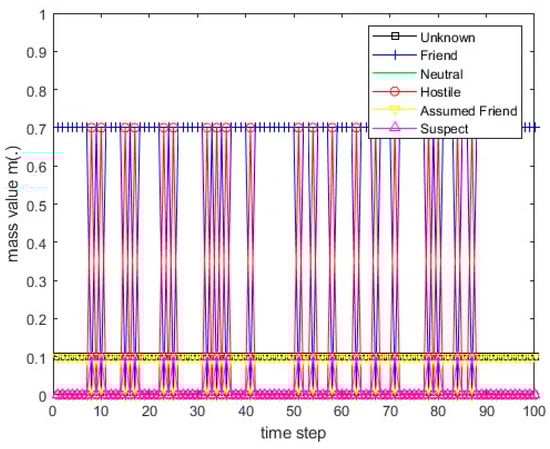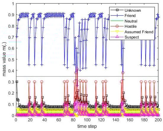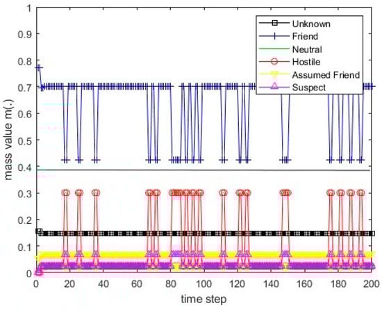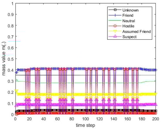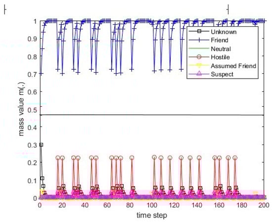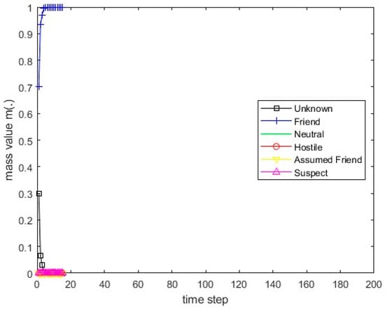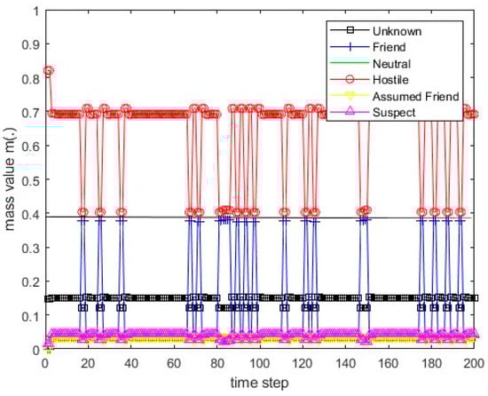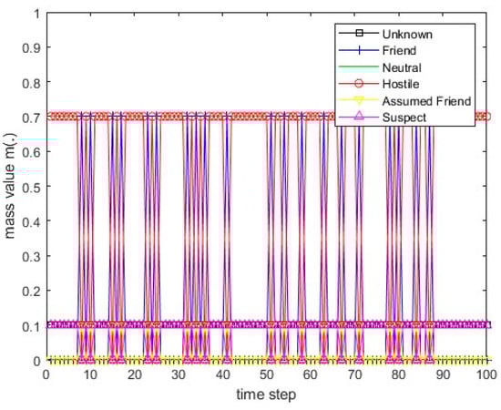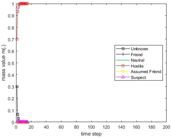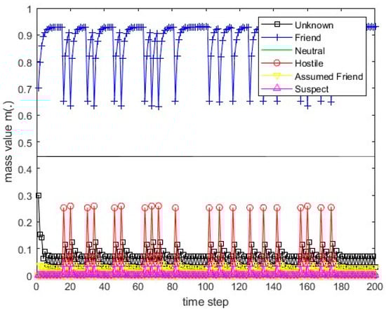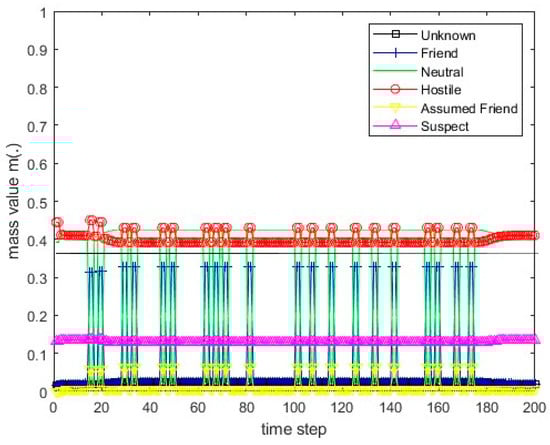 The simulation results of identification information fusion using the PCR5 rule for two BBAs for deterministic scenarios 1–6 are presented in Figure 63, Figure 64, Figure 65, Figure 66, Figure 67 and Figure 68.