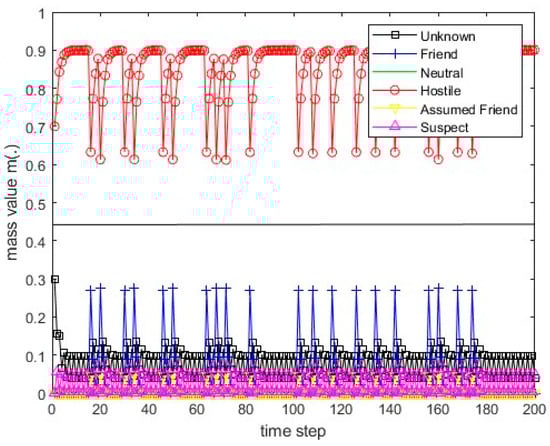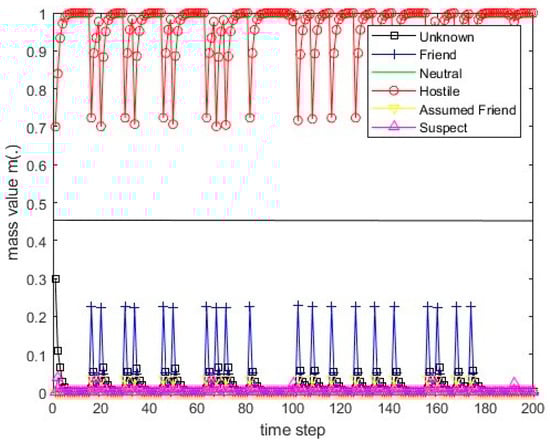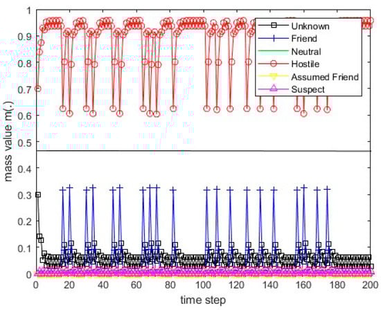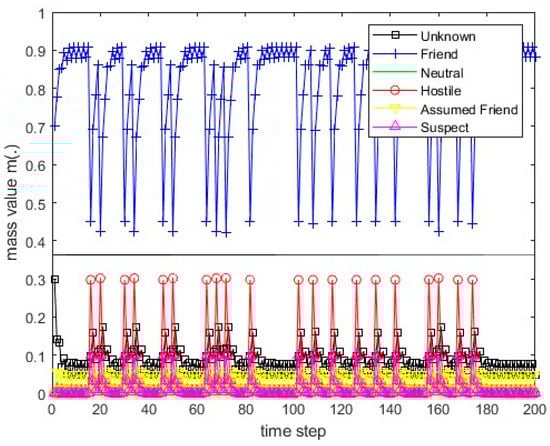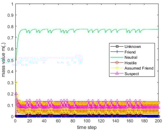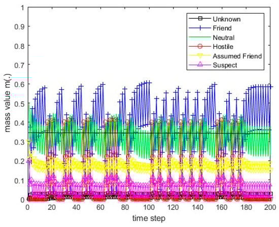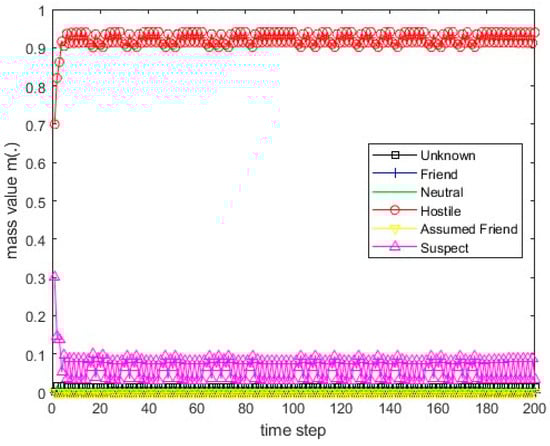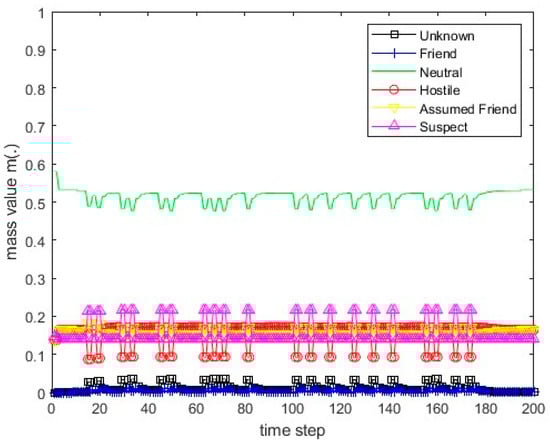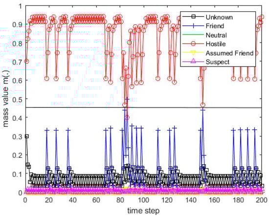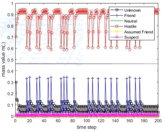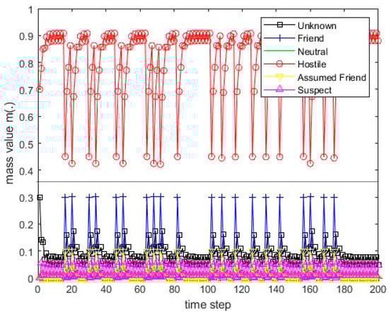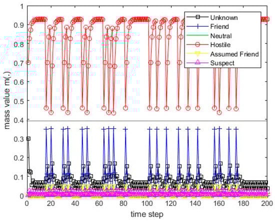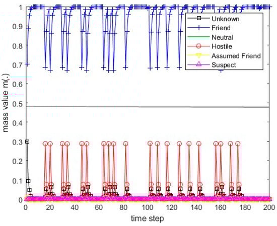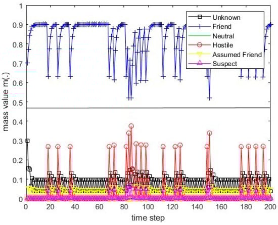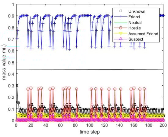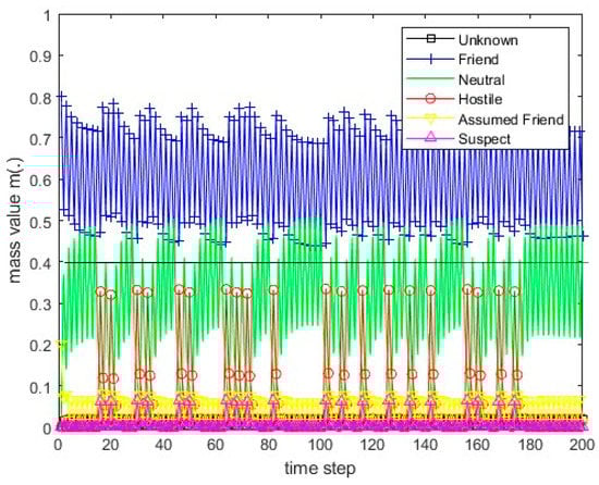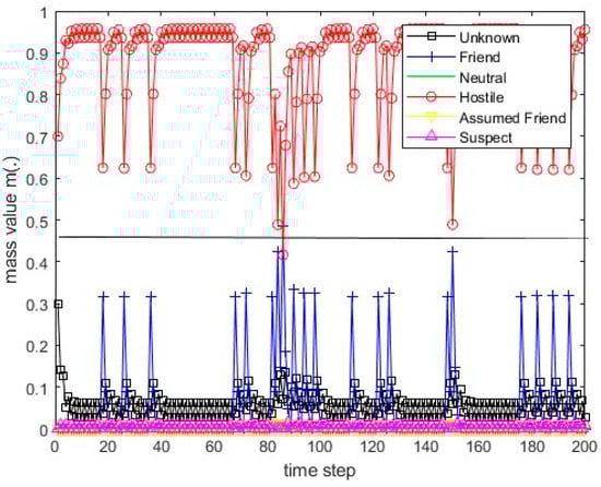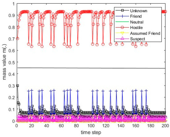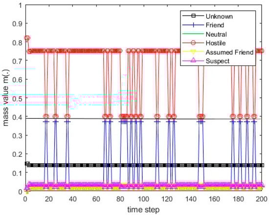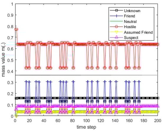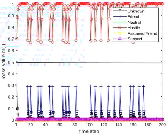 The simulation results of identification information fusion using the PCR5 rule for two BBAs for deterministic scenarios 1–6 are presented in Figure 63, Figure 64, Figure 65, Figure 66, Figure 67 and Figure 68.