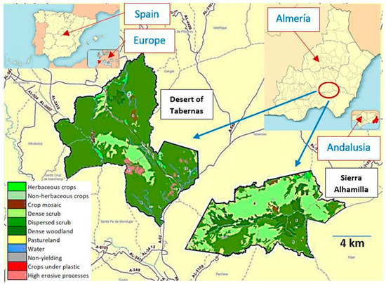 28], the concept of desertification is more functional, and is now being considered as a disturbance that occurs in arid climates and that leads the system (human beings—natural resources) to an irreversible loss of sustainability. On the other hand, erosion consists of the loss of soil by uprooting, transport, and subsequent accumulation, either by the action of wind or water. This phenomenon can be interpreted as a type of soil degradation resulting from desertification, but it is important to note that it is not the sole contributing factor. While wind erosion is the primary form of erosion associated with desertification globally, in the Iberian Peninsula, water erosion takes precedence, representing a prevalent environmental issue across much of Mediterranean Spain. This is particularly evident in the peninsular southeast, which encompasses the Desert of Tabernas and Sierra Alhamilla.