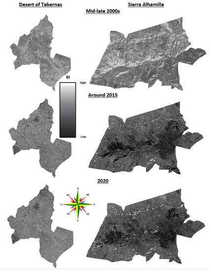 Figure 6, the desert of Tabernas has BI values ranging from 0.66 to 0.95, while the Sierra Alhamilla sites have BI values ranging from 0.20 to 0.60.