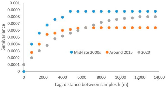 Figure 5) was processed with 17 lags, each spanning a distance of 800 m. The lag values were determined through a trial and error process to optimize the aforementioned criteria. When observed visually, the variograms from the mid-late 2000s and around 2015 appear quite similar, exhibiting a typical variogram shape. Two notable features can be observed. Firstly, the sill of the variogram around 2015 was lower compared to the mid-to-late 2000s, suggesting a decrease in variance in the latter year. Further, the range in the mid-to-late 2000s was 4800 m, while in around 2015, it was 6400 m, which corresponds to the reported walking distance of livestock from their drinking source [