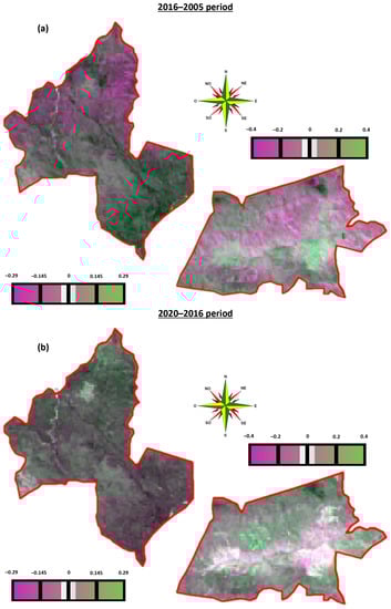 Figure 6a,b. Conversely, during the second period (2020–2016), a significant portion of the area experienced degradation processes (magenta colors), while the area undergoing rehabilitation (green tones) diminished considerably (