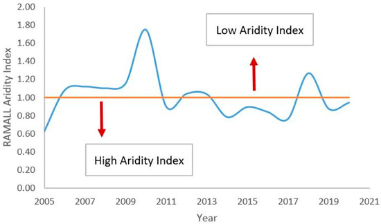 Figure 8, the RAMALL aridity index presented mean values of 1.05 (low aridity index) between 2005 and 2015 and 0.94 (high aridity index) between 2016 and 2020.