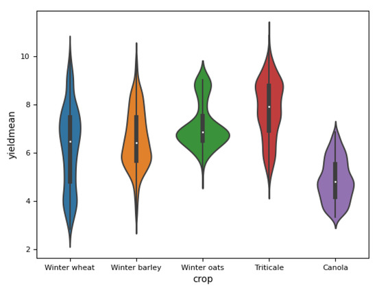 The yield value distribution per crop type is shown in Figure 2, with the median values of the three cereal crops being very similar. In contrast, the median values of triticale and canola crops are higher and lower, respectively.