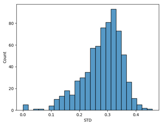 For better visualization, we have analyzed the standard deviation for 1000 random points between all five observation dates for very low nDSM value ranges (where the nDSM range is less than 1 m height), as shown in Figure 4. We concluded that such average fluctuations of 0.28 m in vertical height are negligible. Based on this analysis, we concluded that the automatically generated nDSM_1 is more suitable than the other two nDSM derivation strategies (with higher fluctuations), and we used it as the final CCM feature dataset.