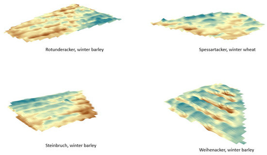 Figure 5 shows three-dimensional views of several parcels where row structures are visible, as well as gaps (sowing/crop failure or other crop damages) and plowing or soil management patterns. Such images could be combined with variable rate application maps for fertilization or other farmer activities.