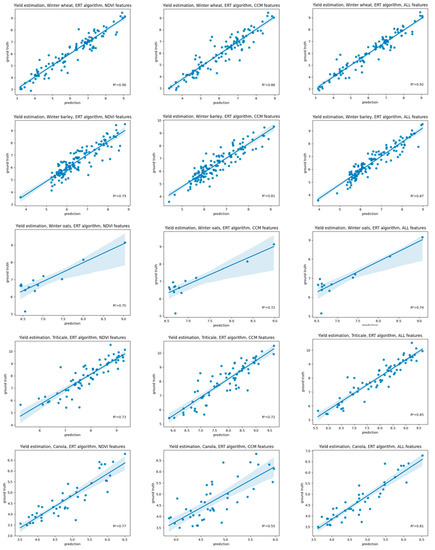 The yield estimation using all CCM and NDVI variables for each crop type led to satisfactory regression results based on the non-linear ERT algorithm, with winter wheat achieving the highest (R2 = 0.92, RMSE = 0.41, MAE = 0.31) and winter oats having the lowest regression accuracy (R2 = 0.74, RMSE = 0.47, MAE = 0.30), as shown in Figure 6. The linear regression, however, failed for the crop types triticale and canola, with R2 less than 0.5, and is not shown in the validation plots. The sampling was performed by drawing model-unseen pixels stratified for a specific crop type using a 95-5 split for training and validation.