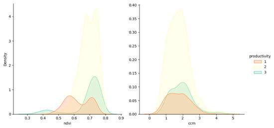 Kernel density plots of mean CCM and NDVI features stratified by three productivity levels.