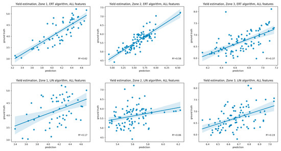 Figure 8 shows different regression results of the linear and Random Forest algorithm for three different productivity levels, taking into account all input features agnostically across all crop types, again proving the assumption that the yield estimation generated better results with a lower error at the lower productivity levels (achieving an R2 score of 0.62, RMSE of 0.35, and MAE of 0.29). In contrast, a distinction of higher yield levels leads to higher estimation errors (with an R2 score of less than 0.4, RMSE of 0.52, and MAE of 0.45) for the ERT and the linear regression algorithms. In contrast, the linear regression only achieves an R2 of less than 0.2 at all levels.
