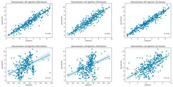 Validation results for a generic yield estimation with different sets of features (CCM, NDVI, and PCA-transformed fusion) demonstrated the better performance of the ERT algorithm (upper row) over the linear regression (lower row).