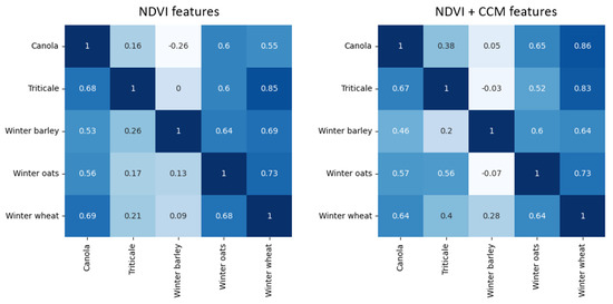 Our analysis proves that the inclusion of CCM-based features for the model transfer improves estimation accuracies for some crop types (canola to winter wheat, winter oats to triticale, and winter wheat to winter barley). In contrast, no improvement could be measured (canola to winter barley, winter oats to canola), or even a decrease in model robustness took place, through assumed contamination of the predictor variables (winter oats to winter barley, triticale to winter oats).