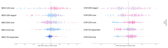 Figure 11 depicts the importance of different observation dates for both datasets, showing that the most significant dates are those close to the peak of the season (or maximum biomass), whereas the dates at or after harvest (with the satellite data capturing harvest residuals and bare soil) have a much lower impact on the model. This is shown through SHAP metrics (SHapley Additive exPlanations), which not only show the importance of each feature but also the positive (positive x-axis) or negative (negative x-axis) impact on the model with lower (red) or higher (blue) feature values, respectively, as well as the distribution of the feature values [29].