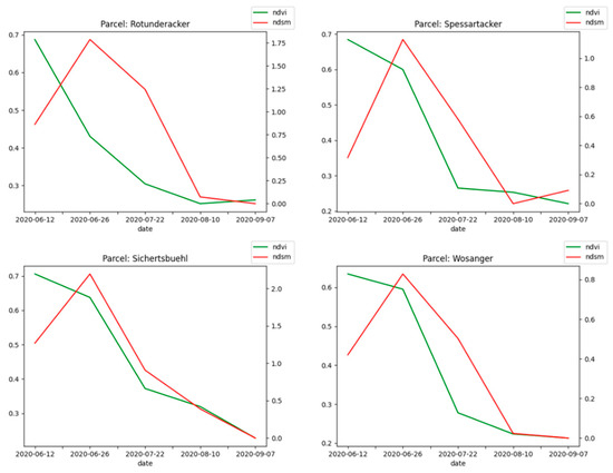 In all cases, except the field “Theateracker” (with winter oats), the nDSM values follow the decreasing NDVI values at the season’s end for all crops (July–August). This observation confirms the initial assumption that, while different crops are maturing after maximum greenness (maximum biomass at the peak of the season), the chlorophyll content is decreasing (yellowing, ripening stages) and leading to a delayed decrease in crop stem heights (pendent stem heads) [30,31]. Moreover, as shown in Figure 12, harvest activity also leads to reduced crop height and decreased NDVI levels by removing stems and above-ground biomass from the respective field.