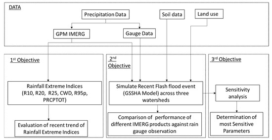 This study is divided into three parts. The first part evaluates recent trends in precipitation extremes related to floods in the three wadis. It is important to identify any increase in the frequency and intensity of extreme rainfall events, which are often attributed to climate change. In the second part, the accuracy of the different IMERG products is compared to ground observations in the hydrological modelling of a recent flash flood event. This analysis is critical for un-gauged areas to determine the reliability of IMERG products in flash flood modelling and prediction. The third and final part of the analysis highlights the parameters that influence the hydrological model output through a sensitivity analysis. This is important to elucidate the parameters that are most influential in arid mountainous regions, similar to the selected wadis. The overall flowchart of the methodology is shown in Figure 2.