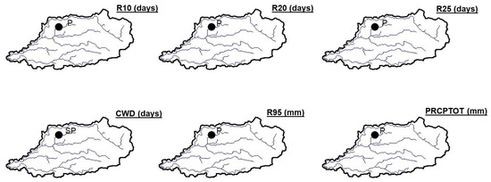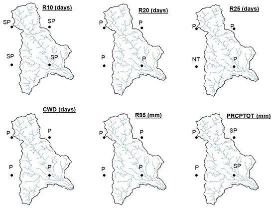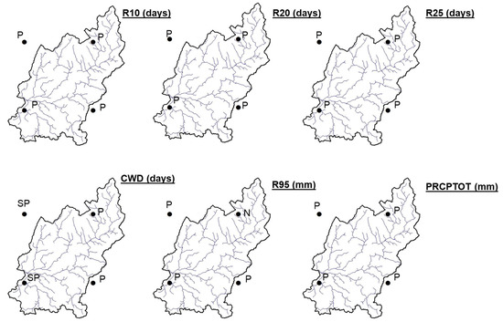 The nonparametric MMK test was used in this study to evaluate the trends of the extreme rainfall indices. The test results can indicate whether the trend is significantly decreasing, increasing, or has no significant trend. A significance level of 0.05 was considered for the analysis. Thus, a significant trend is detected by the MMK test as either increasing or decreasing with a p-value less than the chosen significance level (p < 0.05). In other words, a simple positive or negative trend refers to a general increasing trend or decreasing trend in the data without specifically referring to statistical significance. It indicates a visually observable pattern of increasing or decreasing values over time but without rigorous statistical analysis to determine if the trend is statistically significant. On the other hand, a significant positive or negative trend (p < 0.05) denotes statistical significance.