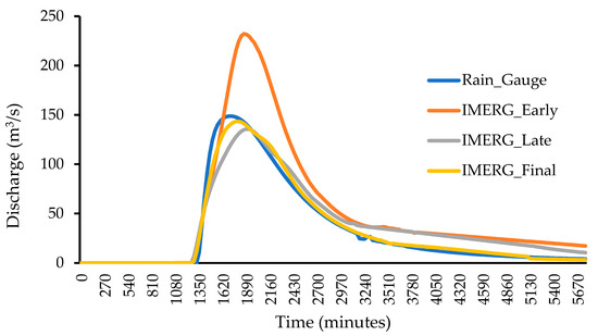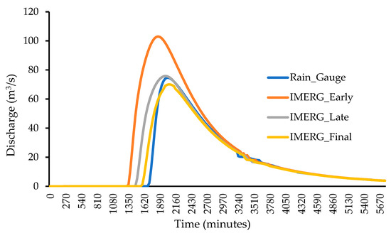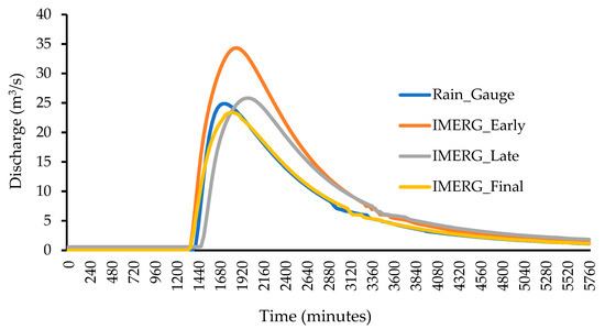 The predicted outlet hydrographs when the GSSHA model was forced by the gauge rainfall and the three IMERG products are shown in Figure 8, Figure 9 and Figure 10. The timing of streamflow captured by the GSSHA model depends on several factors, including the time step used in the simulation, the accuracy of input data, and the complexity of the hydrological processes being simulated. In this study, both the gauges and IMERG data are at a daily time scale, so the observed streamflow variations are captured at a daily time scale. However, the GSSHA model was operated at a finer time scale, with a time step of 60 min. This allows for more detailed variations in streamflow to be captured, including rapid changes that may occur within a day. By using this finer time step, the GSSHA model aims to represent the timing of streamflow events more accurately.