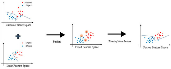 A noise feature occurs when fusion is simply merged in feature space. This makes object detection difficult. Noise features tend to occur when both sensors are weak.