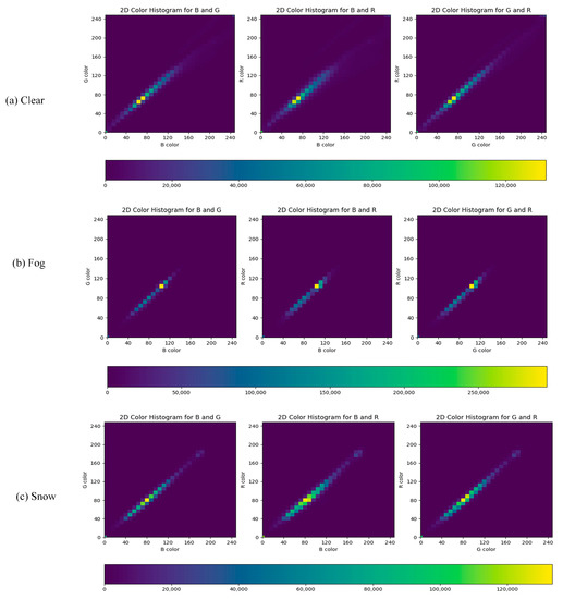 In Figure 4, it is demonstrated that cameras struggle to identify objects in foggy conditions. Although it is daytime, the data distribution of snow is dissimilar to that of clear sunny days, with clustering occurring differently around 80 values. In sunny weather, the values are more closely clustered around 80. However, it is evident that the data distribution has a significant variance at 80 in snowy conditions. In the case of fog, the data values are clustered around 120. Based on this data distribution, the camera and LiDAR data are challenging to be used for network training due to the changes in data distribution unless the input data of the network are refined first.
