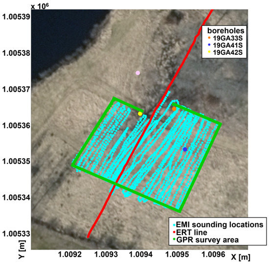 The survey area of the field test. The large yellow, orange, and blue dots represent the boreholes’ locations in the survey area. The large pink dot is a borehole that has not been considered in this study as it is outside the investigated volume. The EMI soundings are shown in light blue; the ERT line is depicted as a red line; the perimeter of the area on which the GPR data have been collected is outlined with green lines. The coordinates have been anonymized.