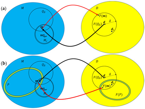 Regularized inversion. is the set of all possible measurements; is the measurements’ vector consisting of the summation of the (ideal, unknowable) true data vector and the noise ; is the forward modeling mapping the models (belonging to the set of possible models ) into the data . Hence, the set of all possible models consistent with the data is . (a) The regularizer selects from a specific solution that also belongs to the correctness set [27]. (b) Distinct from the previous case, the set of all the possible solutions was no longer defined uniquely by , but rather by the intersection , in which the set consists of the samples of the prior distribution.