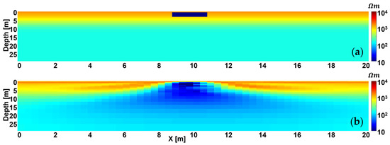 - In the first test, the 2D section consisted of the result of a 2D ERT inversion (Figure 6b). Specifically, the 2D ERT response of the true resistivity model section at (Figure 6a) was first calculated and then inverted. Then, the resulting ERT section (Figure 6b) at that location was used to spatially constrain the EMI inversion.
