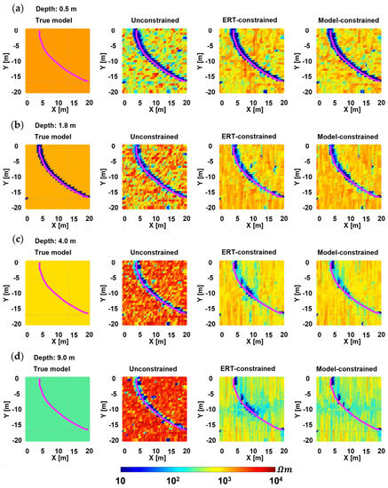 Horizontal slices of the 3D resistivity models in Figure 4. In each row: the true model, the unconstrained inversion, the ERT–constrained result, and the Model–constrained result obtained using the model section at (Figure 6). (a) Slices taken at 0.5 m depth; (b) slices taken at 1.8 m depth; (c) slices taken at 4.0 m depth; and (d) slices taken at 9.0 m depth. As in Figure 4, the horizontal location of the pipeline is shown as a purple line.