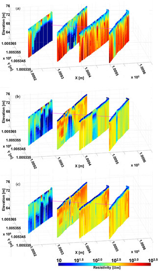 It might be worth mentioning that, in the proposed scheme, the EMI soundings next to the ERT section (or, in general, to any other available source of prior information) were directly conditioned using the resistivity values of the ERT section itself (e.g., Figure 3a), whereas the EMI soundings that were further distant from the ERT section were constrained to the adjacent EMI soundings (towards the original constraint, i.e., the ERT section). Hence, the influence of the original information derived directly from the ERT section competed with the conditioning supplied by the EMI measurements and gradually lost its intensity as a result. This is consistent with the fact that far from the ERT section, we expected a less significant resemblance between the electrical and the electromagnetic results.