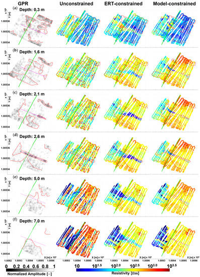 Horizontal sections of the GPR and of the resistivity volumes obtained with different constraining strategies (Figure 8). Each row corresponds to a different depth: (a) ; (b) ; (c) ; (d) ; (e) ; and (f) . The location of the ERT section (and its geoelectrical interpretation) is shown as a green solid line. The assumed position of the pipe is plotted in purple. The red contours are shown as references to the GPR anomalies; their purpose is merely to make the comparisons easier, and they are not necessarily connected to any specific geological features.