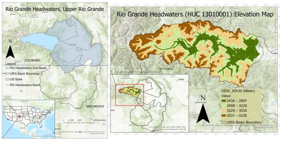 The study watershed is Rio Grande Headwaters (RGH) near Del Norte (Figure 1) of the Upper Rio Grande (URG) basin of southwestern Colorado and northern New Mexico in the United States (US). The RGH is located at the upper reaches of the San Juan Mountains, in the upper part of the URG basin []. A snow-dominated hydrologic regime characterizes the watershed’s hydrology. The watershed covers an area of approximately 3380 square kilometers and includes high-elevation alpine terrain, forested mountain slopes, and some lower-elevation agricultural regions. The elevation of the watershed ranges from 2434 to 4215 m above sea level, with an average of 3230.68 m. Most of the annual streamflow occurs during the spring and early summer as the snowpack melts, which can contribute significant flow to the RG downstream [,]. The URG basin exhibits variability in temperature and precipitation based on latitude and elevation. The watershed’s annual average temperatures are −6 to −1 °C, ranging from −6 to 7 °C, and it receives an average annual precipitation of approximately 630 mm, with much of this falling as snow in the winter months [,]. A series of steep-sided valleys and ridges characterize the topography of the watershed. Overall, the complex landscape and topography of the watershed can pose challenges in accurately simulating flow [].