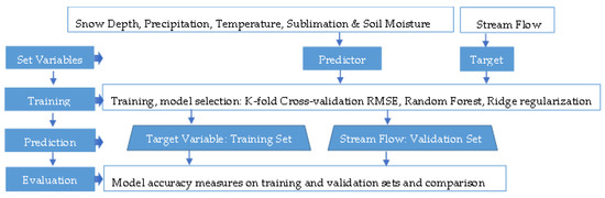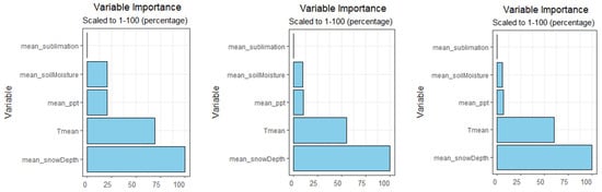 Snowpack properties and distribution are vital for water supplies in snowmelt-dominated river systems, acting as a reservoir and contributing significantly to runoff patterns [,]. Runoff can also be influenced by soil moisture, an essential factor in providing water from snowmelt runoff and precipitation [,]. Based on the literature review [,,,,,], we selected five non-mutually exclusive predictor variables—minimum temperature, snow depth, precipitation, soil moisture, and sublimation for streamflow prediction using the RFML model, as these variables can interact in complex ways and may co-occur to influence streamflow.