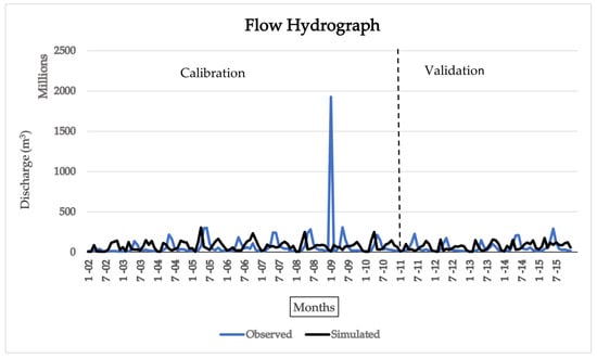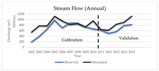 The SWAT model’s annual simulation results provided better accuracy (Table 7) with observed flows; however, a model overestimation (Figure 4) still appeared during calibration and validation periods. The goodness-of-fit metrics, presented in Table 7, provide a means of evaluating model performance and comparing the accuracy of yearly and monthly flow simulations.