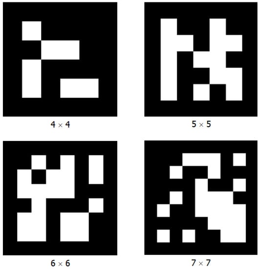 - Garrido-Jurado, S.; Muñoz-Salinas, R.; Madrid-Cuevas, F.J.; Marín-Jiménez, M.J. Automatic generation and detection of highly reliable fiducial markers under occlusion. Pattern Recognit. 2014, 47, 2280–2292. [Google Scholar] [CrossRef]