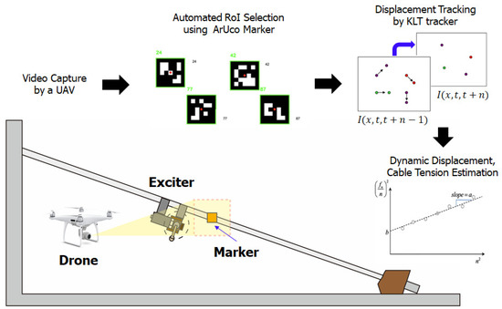 In this section, the proposed UAV-based non-contact cable tension estimation method is described. UAVs can quickly capture target structures without having to install sensors on them. Figure 2 shows a schematic diagram and the tension estimation process. When the cable is vibrated using an exciter capable of applying a sinusoidal load, the attached marker moves accordingly. First, the movement of the marker is captured as a video using the vision sensor mounted on the UAV. Since an ArUco maker is used, it is possible to automatically select the marker’s RoI and obtain an ID from the collected images. Additionally, feature points within the selected RoI are extracted using an image processing algorithm. Finally, the displacement is tracked by the KLT tracker [38,39], which predicts object motion at the same feature distance between two adjacent frames. In this way, dynamic displacement can be obtained and cable tension can be estimated using the vibration method.