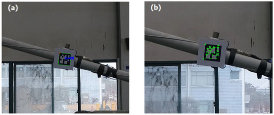 The field of view (FoV) of the camera mounted on the UAV was fixed to the marker installed in the center of the cable, and the UAV collected images while hovering. In addition, using the ArUco marker detection algorithm, markers in an image frame were detected. When a marker is detected, the marker’s ID and RoI are automatically detected, as shown in Figure 3a in Section 3.1. Also, feature points are automatically extracted within the RoI of the image. This series of automated procedures has many advantages in cable tension estimation. In the field of conventional computer vision, installing markers on target structures can be considered negative, but if the surface is marked in the manufacturing stage of cables, cable information, maintenance, etc., can be included in the markers. Since this study was conducted to confirm the feasibility of the UAV-based cable tension estimation method, only the information on a single cable was considered. In addition, by selecting the fiducial marker, the problems of the RoI selection and feature point extraction, which were considered difficult in vision-based structure inspection, were resolved. Lastly, although not considered in this study, ArUco marker-based augmented reality (AR) can be applied in 3D pose extraction for structural health monitoring, which widens the application field.