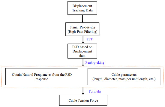 This section describes the procedure used to estimate the cable tension via KLT algorithm-based cable displacement tracking data from video frames. The cable tension estimation method, which is based on the vibration method, will be briefly explained, since many studies have been conducted using this method. Figure 4 shows the procedure for estimating cable tension via the displacement tracking data obtained through the KLT. The first step is high-pass filtering. In general, when the vibration is measured using a wired or wireless accelerometer, a specific frequency range is filtered through signal processing. The drone collects a video while hovering; however, noise occurs because it is not completely stationary. This is due to high-frequency vibrations of mechanical systems, GPS altitude errors, and movements that control the drone’s altitude. Therefore, a filtering process is implemented to obtain an accurate dynamic response [25,40]. In order to set the frequency to be filtered, the vibration component generated in the hovering state of the drone was confirmed through a lab-scale experiment. As a result, it was confirmed that the vibration that occurred in the frequency domain was less than 1 Hz. Since the vibration method-based tension estimation does not use the low natural frequencies of the cable, drone vibration during the hovering state can be processed through high-pass filtering. Although the mechanical vibration may occur in the UAV system, however, this was not considered in this study because it is small in the hovering state and has a high vibration frequency range different from the natural frequency range of the structure. Next, the filtered displacement time history can be transformed to a power spectral density (PSD) using a fast Fourier transform (FFT). It can be assumed that each significant peak in the frequency–response graph corresponds to the eigenmode of the cable. Here, we considered the Peak-Picking method among the several methods which can be used to extract peaks. Then, the cable tension could be calculated by performing linear regression using the natural frequency of the cable corresponding to the extracted peak and the cable parameter.