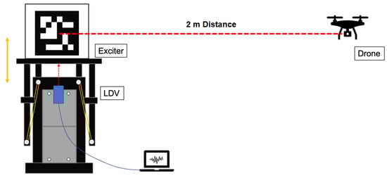 In this experiment, the UAV was able to capture the ArUco marker on the shaking table from the front. The amplitude of the shaking table was adjusted to about 4 cm based on the LDV, and the distance between the drone and the shaking table was maintained at about 2 m.