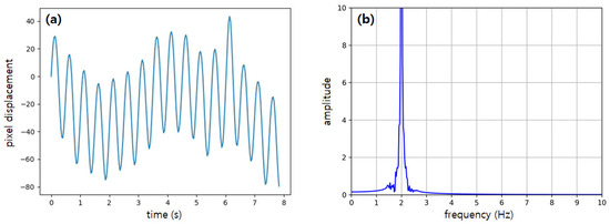 Figure 6 is a graph of the displacement data obtained from the above experiment and the cross power spectral density (CPSD) obtained through the FFT process. Figure 7 is the CPSD result for even Hz. Based on the experimental results, it can be confirmed that the vibration frequency component of the vibration table can be detected using a drone.