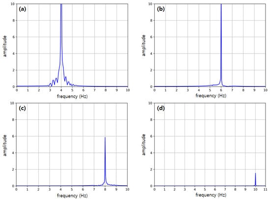 Power spectrum for various excitation frequencies (a) 4 Hz, (b) 6 Hz, (c) 8 Hz, (d) 10 Hz.