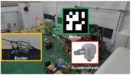 The marker used in this experiment was downloaded from an online ArUco marker generator (http://chev.me/arucogen/, accessed on 10 August 2023). ArUco markers are standard 2D square markers from the OpenSource library, which allows you to create markers with a specific pattern by selecting the marker’s ID, size, and dictionary. The marker attached to the center of the cable was printed as an SVG (Scalable Vector Graphics) file. Since ArUco is a standard marker, the corresponding marker was created by determining the ID and dictionary of the marker. The ID of the marker used in this study was 20, with a size of 50 mm. The dictionary of the marker was 6 × 6 (50, 100, 250, 1000). We also captured the movement of the markers using a commercial drone (i.e., Phantom 4 Pro, DJI). In the cable experiment, experiments were conducted with different frames per second (FPS) settings to compare the tracking performance of the dynamic objects. For the purpose of comparison with the proposed method, acceleration sensors were installed on the cable at a distance 25%, 50%, and 75% away from the fixed anchor, as shown in Figure 8.