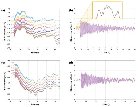When the cable vibrates, the marker also vibrates, and the motion vector between the previous frame and the current frame can be obtained through the optical flow of feature points. Finally, the vibration displacement of the cable can be calculated considering the position of the marker and the homography between the frames. Through the feature points of the image, the same scene or an object can determine the vibration displacement by implementing the algorithm SURF (Speed-up Robust Feature). Figure 9 and Figure 10 show the displacement response under the impact and the sinusoidal excitation, respectively. Experiments were conducted with a difference between 50 FPS and 120 FPS for each load condition. Using optical flow, displacement in pixel units can be obtained for each the feature point (Figure 9a,c and Figure 10a,c). In the figure, there is a difference between the center position and feature point of the camera mounted on the UAV. Therefore, it can be confirmed that a drift appeared in the feature point displacement on the marker. Using signal processing techniques such as filtering and data smoothing, a clean mm-unit displacement was obtained as shown in the figure on the right. The inset of Figure 9b shows the displacement results that are combined from multiple feature points.