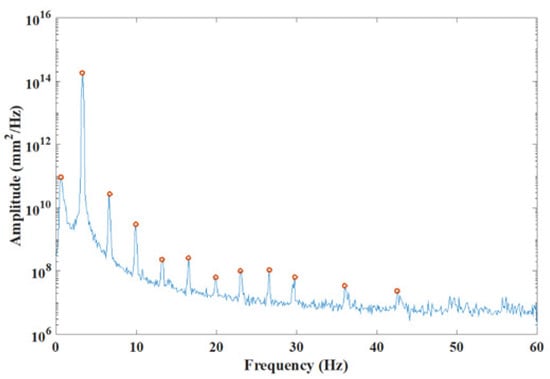 Figure 11 show the result obtained by performing FFT on the time history data (i.e., Figure 10d) obtained at 120 FPS for the sine load. When generating displacement data, signal processing techniques such as filtering and data smoothing were implemented in the same way as the shaking table test, so it can be confirmed that the peak appeared clearly in the frequency domain. The selected peaks in the frequency domain are used for modal analysis in vibrating systems. Peaks expressed in the frequency domain as eigen-modes of the system are intuitively revealed and are therefore widely used [46,47]. A common strategy relating to the peak picking method is to select the maximum value in the frequency domain of the structural response as the peak and each peak in a user-defined sub-frequency range. In the PSD result, the circles represent the peaks derived via the peak picking method. The frequency corresponding to each peak represents the natural mode frequency of the cable. In this study, to reduce the error, the first or higher frequencies among the frequencies obtained through the peak-picking method were excluded. To compare 50 FPS and 120 FPS results, a value of less than 25 Hz was used. As a result, natural frequencies from the first mode to the fifth mode of the cable were obtained. Table 2 shows the natural frequency values for each mode of the cable obtained through this method.