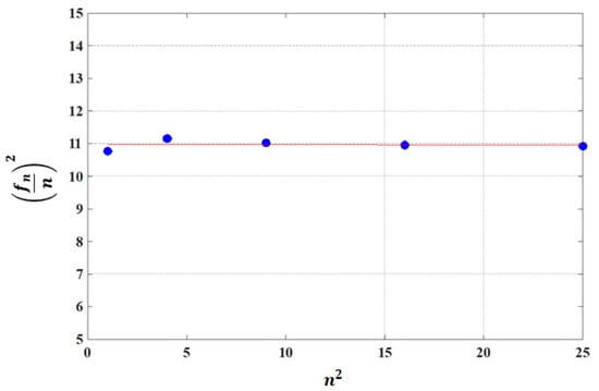 where is the nth damping ratio of the cable, is the axial stiffness proportionality factor related to the sag, and is the cable flexural rigidity [7,36,37]. The natural frequency corresponding to each mode can be extracted from the measured vibration data using the power spectral density (PSD) and the peak-picking method. If the first term on the left is selected as the y-axis and n is selected as the x-axis, the equation for the straight line can be obtained through linear regression analysis. Finally, the cable tension is estimated by calculating the y-intercept (a) via the first-order regression analysis.