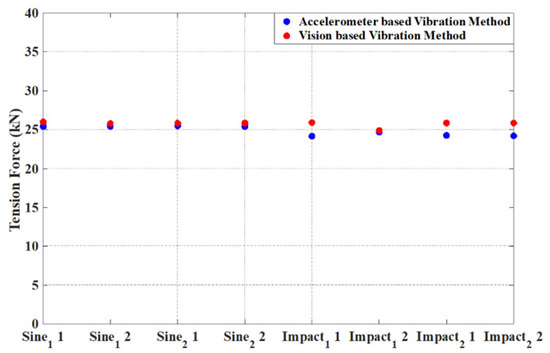 In this study, the experiments were conducted twice with different loads (i.e., sine loads and impact loads) and FPS (i.e., 50 FPS and 120 FPS). The acceleration was measured by fixing the sampling frequency to 120 Hz. Figure 13 compares the tension results obtained using the conventional method versus the proposed method. The x-axis in the figure shows 50 and 120 FPS, respectively, for subscripts 1 and 2 of the load. As a result, the average of the tension values using the conventional method and the proposed method was found to be 24.89 kN and 25.77 kN, respectively, with an error of 3.54%. In this experiment, there is a possibility that the noise was included in the data because the impact load was applied using manpower. When considering only the sine load, which uses an exciter, the error rate was reduced to 1.69%. Therefore, it can be verified that the proposed method is a valid tension estimation method.