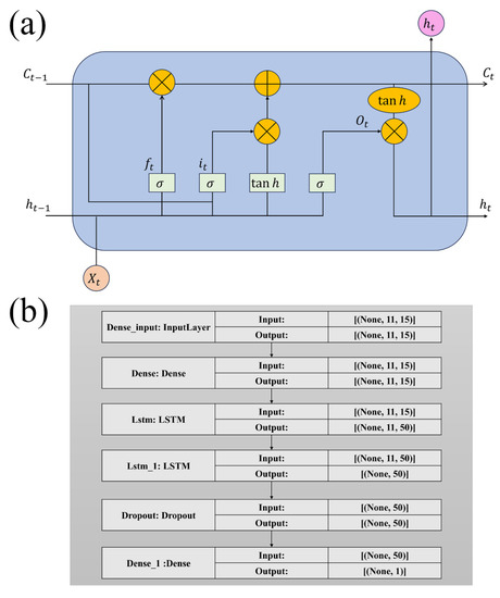 Long short-term memory model (LSTM) structure diagram: (a) LSTM neuronal structure; (b) structure of the subsidence prediction model.