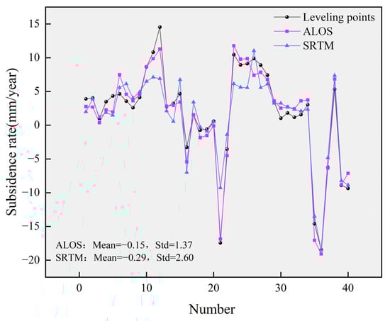 Based on the StaMPS-PS technique, the deformation rate of the study area from 16 July 2015 to 24 October 2021 was obtained. To verify the accuracy of the monitoring results of StaMPS-PS using two kinds of DEM, 40 leveling points along the subway were selected and compared with the results of StaMPS-PS. We converted the results of StaMPS-PS corresponding to the leveling points from the Line of Sight (LOS) to the vertical direction and compared them with leveling data. To evaluate the accuracy between the two effectively, the StaMPS-PS deformation results along the subway lines were interpolated and compared with the leveling results. The results are shown in Figure 3.
