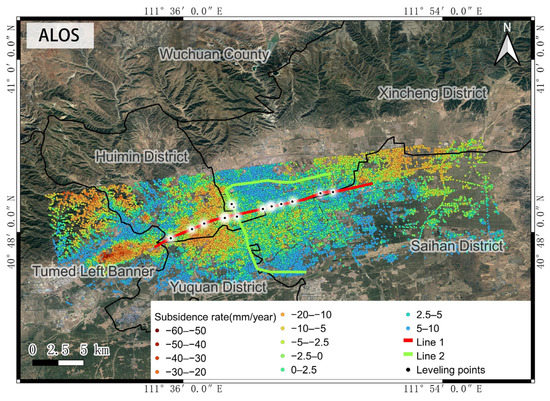 Figure 3 shows that the mean difference between the ALOS and SRTM results and the leveling results is less than 0.5 mm/year, with a standard deviation of less than 3 mm/year, proving the reliability of the StaMPS results. The mean value of ALOS as DEM was −0.15 mm/year, with a standard deviation of 1.37 mm/year, and the mean value of SRTM as DEM was −0.29 mm/year, with a standard deviation of 2.6 mm/year. Therefore, the accuracy of ALOS as a DEM was better than that of SRTM. The subsequent analysis adopted the monitoring results of the ALOS PALSAR DEM. The monitoring results of ALOS are shown in Figure 4.