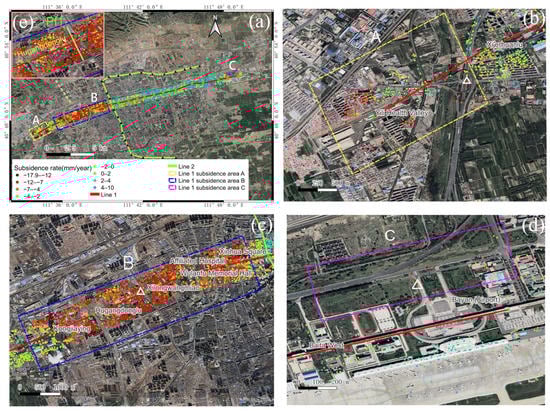 As the Hohhot urban area continues to expand and urban traffic pressure increases, the construction and development of the Hohhot rail transit system are of great significance for alleviating traffic pressure, improving urban transportation convenience, and promoting urban economic development. However, the construction and operation of subways can cause surface deformation above the subway, thereby affecting the safety of buildings and structures along the subway line [1]. Furthermore, the long-term operation of subways can also affect the safety status of ground-level buildings owing to vibrations [2,3,4]. Moreover, the overexploitation of groundwater in Hohhot has recently been severe [5], and the excavation of subway tunnels has further damaged aquifers and soil layers, exacerbating the problem of ground subsidence [6,7]. Land subsidence seriously affects the safety of subway operations and surrounding buildings. For example, collapse accidents have occurred around the subway in Beijing and Hangzhou [8]. Due to the fact that the average daily passenger flow of Hohhot Metro reaches 230,000 people, the loss will be tremendous once an accident occurs. Therefore, subsidence monitoring along the subway line is an important guarantee for the safe operation of the subway.