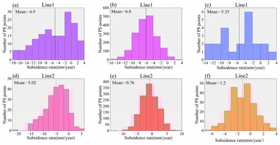 Statistical histogram of deformation rate distribution: (a) Statistical histogram of deformation rate distribution in subsidence area A of subway line 1; (b) statistical histogram of deformation rate distribution in subsidence area B of subway line 1; (c) statistical histogram of deformation rate distribution in subsidence area C of subway line 1. (d) Statistical histogram of deformation rate distribution in subsidence area A of subway line 2; (e) statistical histogram of deformation rate distribution in subsidence area B of subway line 2; (f) statistical histogram of deformation rate distribution in subsidence area C of subway line 2.